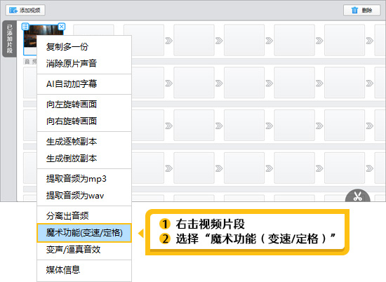 在视频剪辑界面,用鼠标右击视频片段,在弹出菜单,选择“魔术功能(变速/定格)”。