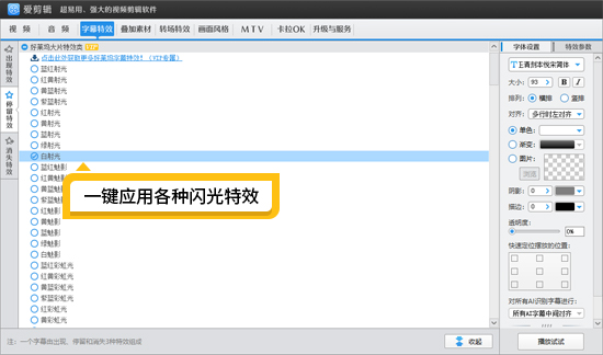 接下来,在左侧栏目中点击“停留特效”栏目,这里你将看到海量的光效字幕效果。你可以根据自己的需求一键勾选想要的效果。例如,选择“好莱坞大片特效类”,并勾选“白射光”,就可以得到一个白色的闪光字幕效果。如果你需要其他颜色,可以在这里选择其他相应的特效。